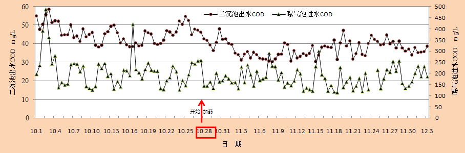 生物增效剂:加水配制成1000 mg/L溶液,投药位置为处理单元的进水口附近,投加浓度为1-100 mg/L。