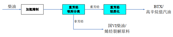 柴油原料分级利用,实现提质增效:先通过吸附分离将柴油中芳烃与非芳烃组分进行分离,然后根据原料特性针对性的选择高值化利用途径,达到降低柴汽比、增产化工品、实现柴油提质增效的目的。