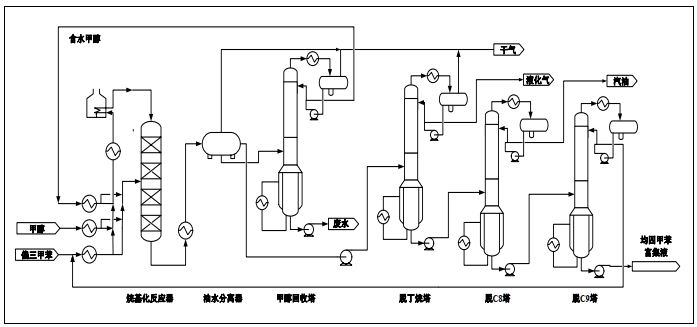适用于以 C6~C9 的(甲基)芳烃、甲醇为原料,生产高附加值的多甲基苯工艺,目的产品具体包括混二甲苯、偏三甲苯、均四甲苯等。